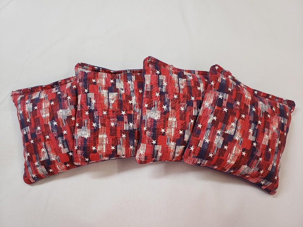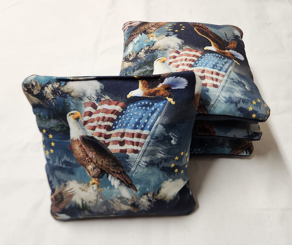 Our Patriotic bags are regulation size and weight. Our bags are made from 2 layers of heavy duty duck cloth with one side having an additional layer of cotton added. Measuring 6"x 6" and weigh between 15-16 ounces filled with either traditional whole corn or all weather resin beads. All bags are sold in 4 bag sets with selection of any of our solid colors on the reverse side.