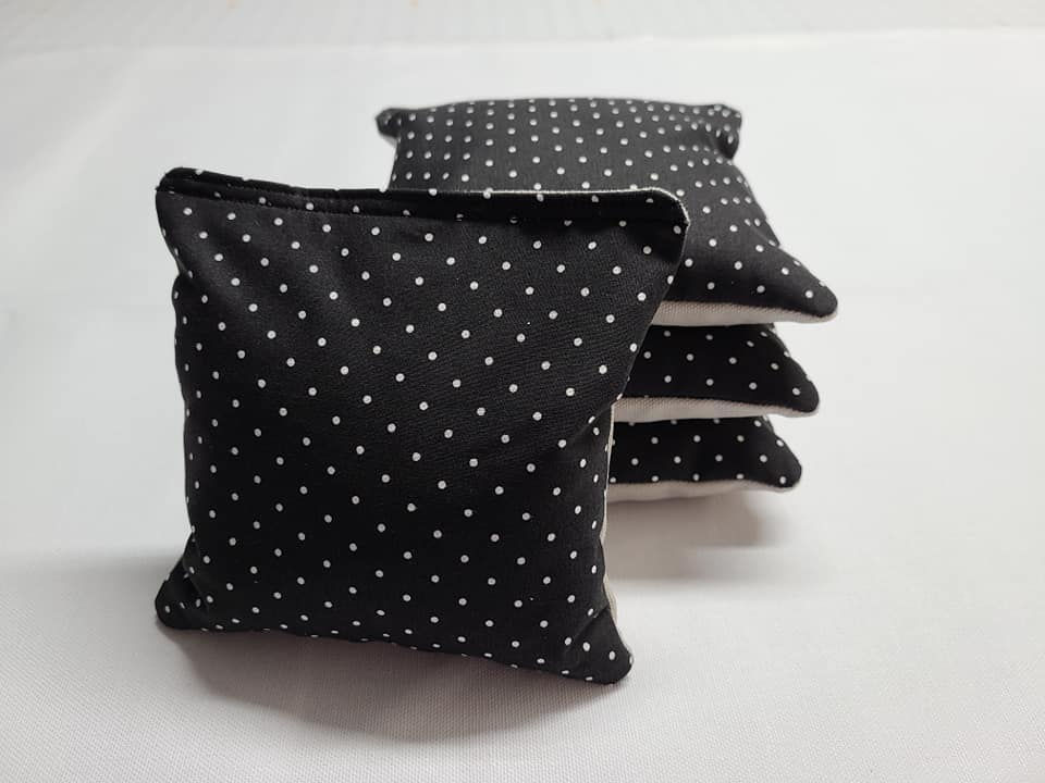 Our bags are regulation size and weight. Our bags are made from 2 layers of heavy duty duck cloth with one side having an additional layer of cotton added. Measuring 6"x 6" and weigh between 15-16 ounces filled with either traditional whole corn or all weather resin beads. All bags are sold in 4 bag sets with selection of any of our solid colors on the reverse side.